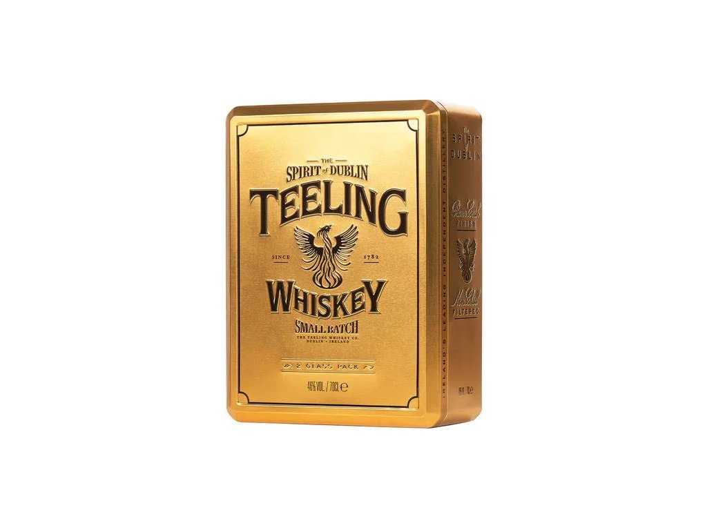 Dárkové balení obsahuje láhev Teeling Small Batch a dvě originální skleničky.