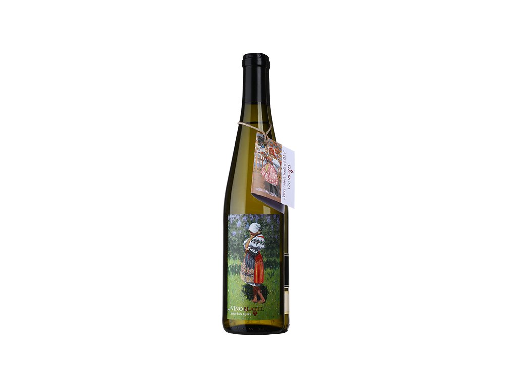Ryzlink rýnský 2023 z Vinařství Blatel, VOC víno s 12,5?% alkoholu. Suché bílé víno z trati Nadhájčí s minerální strukturou a uměleckou etiketou Joži Uprky.